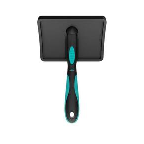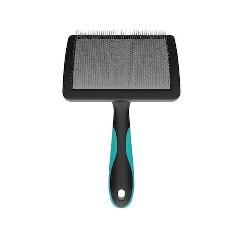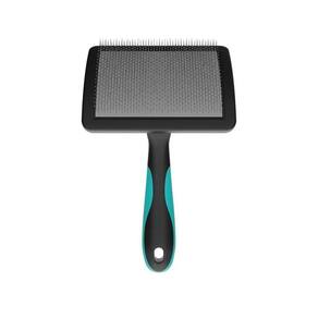 A Rasqueadeira Curva Grande com Bolinhas - Propetz possui pinos em aço inoxidável flexíveis e com a ponta protegida com pinos emborrachados que proporcionam uma massagem agradável na pele do animal, sem risco de arranhar, além de alisar o pelo.
