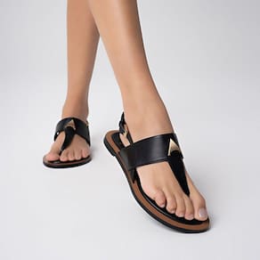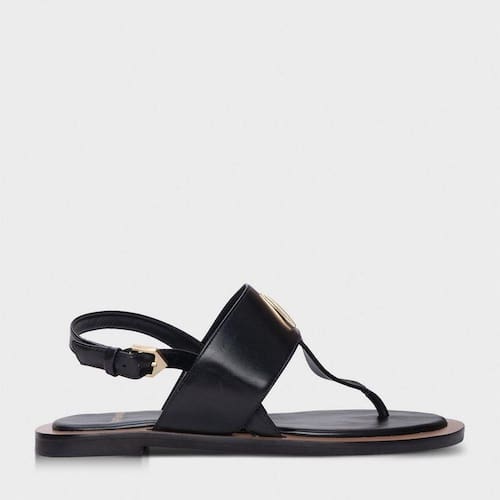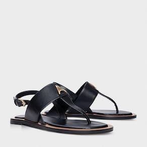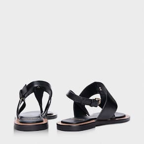 Sandália flat de couro. O modelo tem salto baixo bloco e bico redondo. Possui uma tira larga com aplicação do ícone Carrano sobre o peito do pé e outra tira fina que divide os dedos. Fechamento na parte traseira com fivela ajustável.