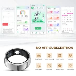 Anel inteligente para homens e mulheres, monitor de bem-estar e fitness com contador de sono/passo/frequência cardíaca/oxigênio no sangue/calorias, anel vestível à prova d'água IP75 para iOS Android Silver — Rastreamento abrangente de bem-estar: nosso anel inteligente monitora as principais métricas de bem-estar, incluindo frequência cardíaca, níveis de oxigênio no sangue e padrões de sono (sono profundo, sono leve, ciclos REM e despertares). Ele também oferece suporte a insights sobre o bem-estar feminino, rastreamento diário do gasto calórico e análise de gerenciamento de desconforto para ajudar os usuários a otimizar a recuperação e os hábitos diários