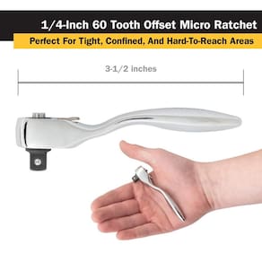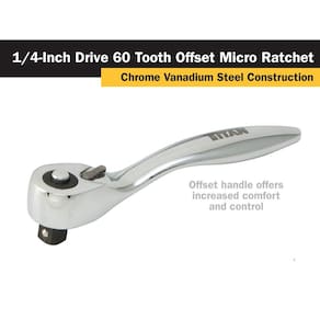 Titan 11204 1/10.2 cm x 3-1/5.1 cm 60 dentes offset micro catraca - Unidade de 1/10.2 cm | Comprimento total de 8,5 cm - Estrutura de cromo-vanádio para durabilidade e resistência | alça ergonômica e offset oferece maior conforto e controle - O mecanismo de catraca reversível de 60 dentes produz uma varredura mínima de 6 graus - perfeita para áreas apertadas, confinadas e difíceis de alcançar - O recurso de liberação rápida segura o soquete e permite fácil remoção - Feito em Taiwan