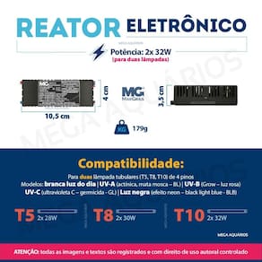 O Reator Margirius 2X30W é compatível com lâmpadas ultravioletas de diferentes tipos, como germicida, actínica, grow, luz negra, entre outras. Ele é ideal para ligar lâmpadas com 4 pinos fluorescentes, garantindo uma maior eficiência e durabilidade das lâmpadas.