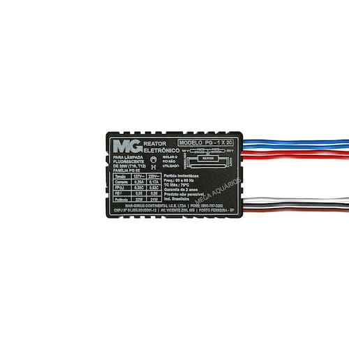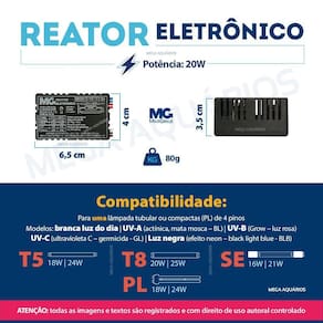 Reator eletrônico margirius para ligar uma lâmpada tubular ultravioleta uvc uva uvb germicida, actínica, grow, luz negra ou branca luz do dia comum fluorescente de 20wOs reatores eletrônicos da margirius são os mais indicados para as lâmpadas ultravioletas germicida, actínica, grow, luz negra ou para lâmpadas comuns de quatro pinos. São de fácil instalação e geram uma economia de 30% em comparação aos reatores eletromagnéticos.Características:Indústria nacional SeguroCompactoModelo ideal para ligar lâmpada ultravioleta germicidaReator eletrônico para acender uma lâmpadaPara lâmpada de 4 pinos fluorescentePartida instantânea30% mais econômico em relação aos modelos eletromagnéticosMaior eficiência e durabilidade para as lâmpadasNão é a prova dáguaCompatibilidade:Modelos de lâmpadas: t5 t8 t10 t12 se plQuantidade de pinos na lâmpada: 4Potência da lâmpada: 16w 18w 20w 21w 24w 25wTipos de lâmpadas:Comum e ultravioletas:Branca luz do diaUva actínica, mata mosca - bl Uvb grow - luz rosa Uvc ultravioleta c - germicida - gl Luz negra efeito neon - black light blue - blb Especificações:Fabricante: margiriusModelo: pg - 1x20Voltagem: pode ser ligado em 110v ou 220vDimensões: 6,5 x 3,5 x 4cm larg x alt x profundidadePeso: 80gCorrente: 0,29a 127v / 0,17a 220v Potência: 22w 127v / 21w 220v Temperatura máxima de trabalho: 75cObservações e precauções:A instalação deve ser feita por um profissional especializadoInstalar o reator conforme o esquema de ligação gravado no corpo do produto;Isolar corretamente o fio não utilizadoTrocar a s lâmpada s somente com o reator desligadoNão instalar o reator em ambientes úmidos, sujeito a intempéries ou em locais em que a temperatura ambiente seja inferior a 10ºc ou superior a 45ºc;Não recomendamos aumentar o comprimento dos cabos da s lâmpada s por mais de 2 metros, bem como enrolá-los ou trançá-los entre si ou com outros cabos.Obrigado pela visita e boas comprasAtençãoNossas imagens e textos são registrados e com direito de uso autoral controlado e reservado a essa loja e as lojas parceiras devidamente autorizadas em contrato.