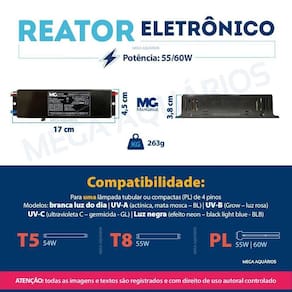 Reator eletrônico margirius para ligar uma lâmpada tubular ultravioleta uvc uva uvb germicida, actínica, grow, luz negra ou branca luz do dia comum fluorescente de 55w 60wOs reatores eletrônicos da margirius são os mais indicados para as lâmpadas ultravioletas germicida, actínica, grow, luz negra ou para lâmpadas comuns de quatro pinos. São de fácil instalação e geram uma economia de 30% em comparação aos reatores eletromagnéticos.Características:Indústria nacional SeguroCompactoModelo ideal para ligar lâmpada ultravioleta germicidaReator eletrônico para acender uma lâmpadaPara lâmpada de 4 pinos fluorescentePartida instantânea30% mais econômico em relação aos modelos eletromagnéticosMaior eficiência e durabilidade para as lâmpadasNão é a prova dágua.Compatibilidade:Modelos de lâmpadas: t5 t8 t10 t12 se plQuantidade de pinos na lâmpada: 4Potência da lâmpada: 54w 55w 60w Tipos de lâmpadas:Comum e ultravioletas:Branca luz do diaUva actínica, mata mosca - bl Uvb grow - luz rosa Uvc ultravioleta c - germicida - gl Luz negra efeito neon - black light blue - blb .Especificações:Fabricante: margiriusModelo: pg - 1x55/60 uvVoltagem: pode ser ligado em 110v ou 220vDimensões: 17 x 3,8 x 4,5cm larg x alt x profundidadePeso: 263gCorrente: 0,77a 127v / 0,46a 220v Potência: 58w 127v / 63w 220v Temperatura máxima de trabalho: 75c.Observações e precauções:A instalação deve ser feita por um profissional especializadoInstalar o reator conforme o esquema de ligação gravado no corpo do produto;Isolar corretamente o fio não utilizadoTrocar a s lâmpada s somente com o reator desligadoNão instalar o reator em ambientes úmidos, sujeito a intempéries ou em locais em que a temperatura ambiente seja inferior a 10ºc ou superior a 45ºc;Não recomendamos aumentar o comprimento dos cabos da s lâmpada s por mais de 2 metros, bem como enrolá-los ou trançá-los entre si ou com outros cabos.Obrigado pela visita e boas comprasAtençãoNossas imagens e textos são registrados e com direito de uso autoral controlado e reservado a essa loja e as lojas parceiras devidamente autorizadas em contrato.
