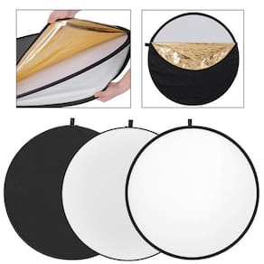 O rebatedor circular h08b refletor 5 em 1 dobrável de 80cm é um refletor de estúdio utilizado para preencher os espaços sombreados na hora da fotográfia, especialmente para uso externo, refratar a luz, destaque os detalhes que precisam ser claros. É necessária luz suave e brilhante para a fotografia de retratos e, em um ambiente interno, o rebatedor 5 em 1 é exigência para se obter uma excelente imagem. Desenvolvido em formato circular, o rebatedor fotográfico 5 em 1 possui cinco superfícies refletoras diferentes pode ser utilizado para preencher, refletir, difundir, absorver ou suavizar a luz. Ajudando a aumentar a eficiência de criação de fotografia, que pode ser utilizado para preencher difusa, absorve ou suaviza a luz. Isso serve como um acessório útil para qualquer tipo de fotógrafo. Rebatedor fotográfico possui cinco superfícies refletoras: rebatedor prata: possui alto contraste e aumenta os destaques, para menor realce da área de sombra. Rebatedor ouro/dourado: obtém tons de pele brilhantes quentes, para maior realce da área da sombra, e realça o tom da pele para uma aparência mais natural. Rebatedor preto: bloqueia a luz indesejada, para alterar o contraste de um objeto, pode ser utilizado como um pano de fundo. Rebatedor branco: produz temperatura de cor neutra, um menor realce da área de sombra, ou pode ser utilizado como pano de fundo branco para retratos. Rebatedor difusor translúcido: imagens mais suaves, sem sombra; ira filtrar a luz solar direta para criar uma luz branca suave neutra, excelente para fotografias ao ar livre. Características: 5 em 1: prata, ouro/dourado, preto, branco e difusor translúcido compacto, de fácil abertura e fechamento pode ser dobrado e colocado dentro de uma bolsa de transporte inclusa carpa reversível com zíper para rápida troca de cores de faces