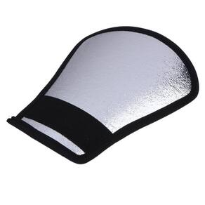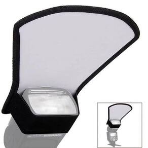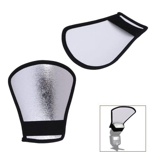 O rebatedor universal dupla face modifica a luz do flash speedlight. As duas faces resultam em efeitos diferentes: a face branca espalha e rebate a luz enquanto ressalta as cores neutras, e a face prateada reflete a luz em tons prateados, aumentando a intensidade e os reflexos especulares, resultando em maior contraste na imagem.