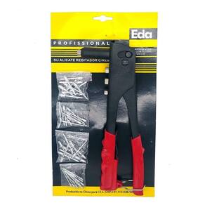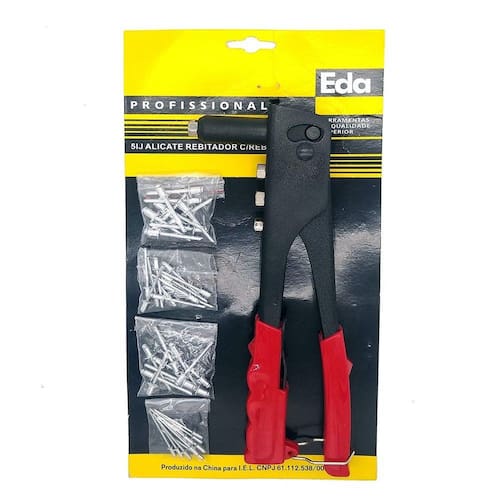 Instruções de Uso: Com uma furadeira fure seu trabalho nos locais onde deseja rebitar (caso já exista uma furação, pule está etapa). Encaixe o rebite no furo. Escolha a ponta aplicável com o rebite. E com o cabo aberto, encaixe a rebitadeira no rebite. Aperte o cabo até o pino do rebite estourar. Afrouxe o cabo e a haste do rebite sairá
