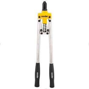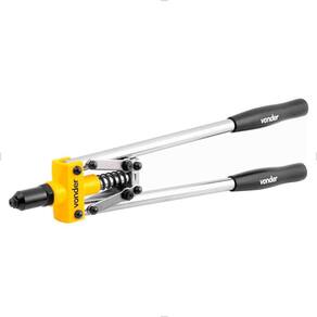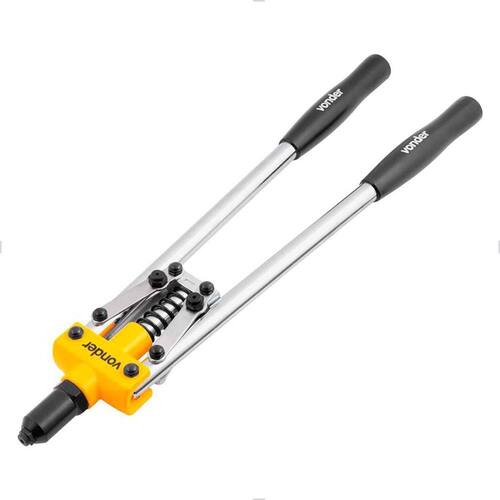 Ref.: 3581450000. Marca: Vonder. Modelo: RA-450. Material do corpo do rebitador: Aço carbono. Comprimento total do rebitador: 450,0 mm. Tipo do rebite indicado: Alumínio e aço inox. Diâmetro máximo de rebite: 4,8 mm. Quantidade de bicos do rebitador: 3 bicos. Massa aproximada (peso): 1,07 kg.