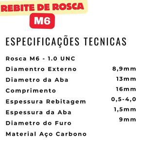 Rosca M6 Diâmetro Ext. 9mm Diâmetro da Aba 13mm Comprimento 16mm Espessura de Rebitagem 0,5 - 4,0 Espessura da Aba 1,5mm Passo / Rosca 1.0 UNC