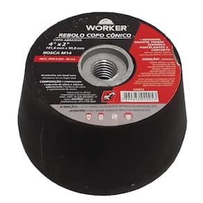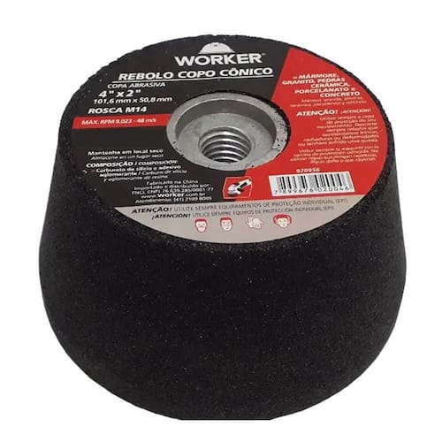 Descrição do Produto: Rebolo Copo Cônico 4 Pol. Granito - Porcelanato Worker Os rebolos são fabricados com objetivo de desbastar e polir mármores, granitos, granilites e concretos em geral. Utilizados para boleamento e acabamento de mármores, granitos e porcelanato. Para trabalho a seco ou refrigerado com água. Pode ser utilizado em mármore, granito, pedras, cerâmica, porcelanato e concreto; - Fabricante: Worker - Grão: G60 - Dimensões: 4 - 101,6 x 50,8 x 14 mm - Velocidade máxima permitida: 9023 rpm - 48m/s - 970956 Ean: 7899676020046
