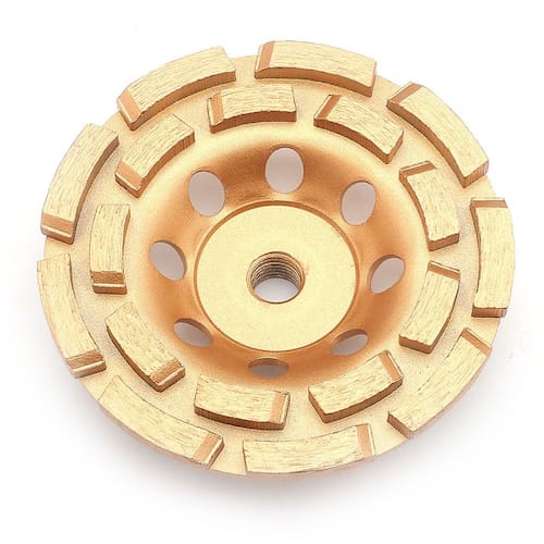 Rebolo diamantado Segmentado para desbaste 2 linhas Utilizado para afiação e polimento de mármore, concreto, granito e outras superfícies de moagem e polimento Diametro: 115mm Rosca: M14 Grão de diamante: 400/500 mkm Concentração de diamante: 20% Ean: 7899612780553