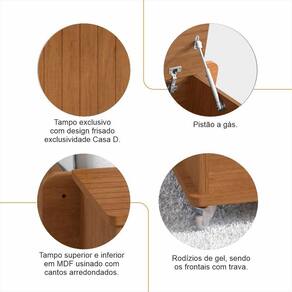 O Banco Baú Luca une funcionalidade e estética sofisticada. Possui tampo superior e inferior em MDF usinado com cantos arredondados e design frisado exclusivo da Casa D. A abertura conta com pistão a gás, garantindo mais e facilidade no uso. A porta frisada complementa o visual moderno. Para facilitar a movimentação, possui rodízios de gel giratórios, sendo os frontais com trava para mais .