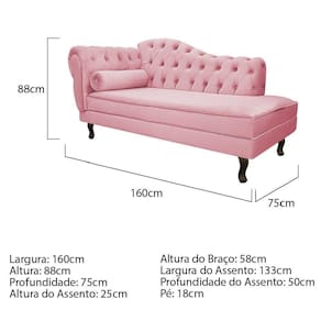 Com uma estrutura e beleza única, o Recamier Diana Lado Direito se adapta em qualquer ambiente, tornando-o ainda mais elegante e harmonioso. Um Recamier luxuoso de alta qualidade, dará um toque especial em seu ambiente. Não perca essa oportunidade de levar mais charme e requinte ao seu cômodo, adquira já o seu! Especificações Técnicas do Recamier Diana: - Altura: 88 cm; - Largura: 160 cm; - Profundidade: 75 cm; - Altura do Assento: 25 cm; - Altura do Braço: 58 cm; - Largura do Assento: 133 cm; - Profundidade do Assento: 50 cm; - Altura dos Pés: 18 cm; - Peso: 35 kg. - Peso Suportado: 220 kg. Diferenciais do Recamier Diana: - Material da Estrutura: fabricado com Madeira Pinus e Eucalipto Reflorestada, e alguns detalhes em MDF; - Tipo de Assento: estofado e com espuma de densidade D-26; - Tipo de Encosto: estofado e com espuma de densidade D-18; - Detalhes do Tecido: possui detalhes em capitonê, onde os botões são revestidos no mesmo tecido do produto e finalizados com excelente acabamento; - Detalhes dos Pés: acompanha kit de pés (4 pés) de madeira, no estilo Luis XV com alta resistência; - Volumes: nessa compra você receberá um único produto. Recomendações de limpeza: -Limpar com flanela limpa e seca. Não molhar o móvel e não expor em lugar úmido ou próximo de fontes de calor. Não usar produtos abrasivos.