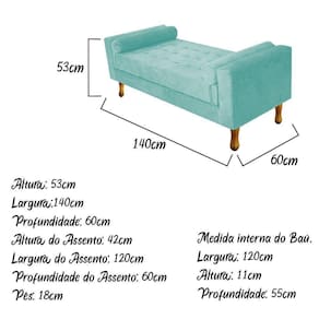 Com uma estrutura e beleza única, o Recamier Félix se adapta em qualquer ambiente, tornando-o ainda mais elegante e harmonioso. Um Recamier luxuoso de alta qualidade, dará um toque especial em seu ambiente. Não perca essa oportunidade de levar mais charme e requinte ao seu cômodo, adquira já o seu! Especificações Técnicas do Recamier Félix: - Altura: 53 cm; - Largura: 140 cm; - Profundidade: 60 cm; - Altura do Assento: 42 cm; - Largura do Assento: 120 cm; - Profundidade do Assento: 60 cm; - Altura dos Pés: 18 cm; - Peso: 35 kg. - Peso Suportado: 220 kg. Medida Interna do Baú: - Altura: 11 cm; - Largura: 120 cm; - Profundidade: 55 cm; Diferenciais do Recamier Félix: - Material da Estrutura: fabricado com Madeira Pinus e Eucalipto Reflorestada, e alguns detalhes em MDF; - Tipo de Assento: estofado e com espuma de densidade D-26; - Tipo de Encosto: estofado e com espuma de densidade D-18; - Detalhes do Tecido: possui detalhes em botonê, onde os botões são revestidos no mesmo tecido do produto e finalizados com excelente acabamento; - Detalhes dos Pés: acompanha kit de pés (4 pés) de madeira, no estilo Luís XV, com alta resistência; - Volumes: nessa compra você receberá um único produto. Recomendações de limpeza: -Limpar com flanela limpa e seca. Não molhar o móvel e não expor em lugar úmido ou próximo de fontes de calor. Não usar produtos abrasivos. Observações Importantes: - As imagens ambientadas são meramente ilustrativas e podem apresentar itens que não compõe o produto; - Objetos decorativos que aparecem na foto não acompanham o produto; - As cores do produto podem variar de acordo com o monitor, a iluminação do ambiente, ou sua percepção visual; - O Recamier Félix chegará montado para você, bastando rosquear os pés; - Confira as dimensões antes da compra e certifique-se de que o produto passará por elevadores, portas e corredores, já que nossa entrega não inclui a subida de lances de escada, ou o lançamento de produtos; - Ao receber seus produtos, verifique no ato do recebimento qualquer dano na embalagem. Caso tenha alguma avaria, favor não assinar o comprovante de recebimento (A transportadora tem obrigação de esperar a conferência); - Produto para uso residencial em ambiente interno, não devendo ficar exposto diretamente ao sol, calor e umidades excessivas.