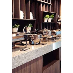- É acompanhado por uma tampa de vidro que permite a visualização dos alimentos, suporte para descanso da tampa durante seu o uso e um fogareiro, que auxilia na conservação da temperatura dos alimentos.