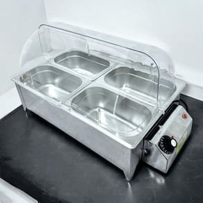 Potência: 750 watts Capacidade: 4 cubas de aço inox, Medidas do Produto: 50 cm de largura, 31 cm de comprimento, 32 cm de altura Tampa: Acrílico resistente e fácil de limpar Voltagem: 127V