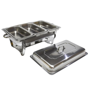 Rechaud 11L com 3 cubas GN 1/3. Ideal para servir três alimentos diferentes mantendo sabor e temperatura com elegância.