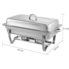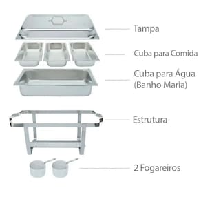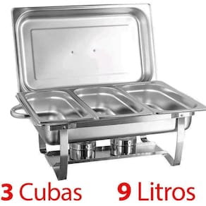 Rechaud Brinovar Retangular Inox 9 L 3 Cubas GN 1/3 x 65 mm e Tampa RemovívelProduzido em Aço InoxidávelNão solta resíduos nos alimentosContém quatro cubas removíveis, três para os alimentos com capacidade de 3 litros cada e outra para a água banho-maria com capacidade de 9,5 litros, que mantém os alimentos aquecidos pelo calor do s fogareiro s .Utiliza cubas de tamanho global GN , podendo ser utilizadas em outros Rechauds ou Buffets.Dobrável, compacto e fácil de transportar. Excelente para casa, quem tem pouco espaço e ótimo para transportar.Dimensões do Rechaud C x L x A : 63,5 x 36 x 31 cmCapacidade: 9,5 Litros de banho-mariaCapacidade das 3 cubas de alimentos: 9 litros totalConteúdo da Caixa3 Cubas GN de 1/3 x 65 mm para os alimentos 9 Litros 1 Cuba para a água com até 9,5 L1 Suporte para as cubas, tampa e fogareiros2 Fogareiros1 TampaDimensões da Caixa C x L x A : 63 x 37 x 14 cmPeso: 5,17 kg