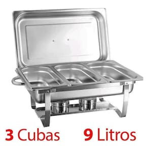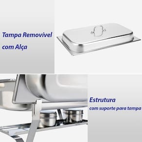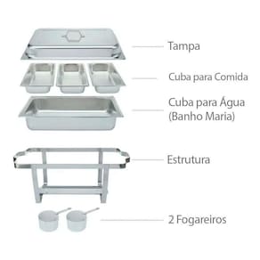Contém quatro cubas removíveis, três para os alimentos com capacidade de 3 litros cada e outra para a água banho-maria com capacidade de 9,5 litros, que mantém os alimentos aquecidos pelo calor do s fogareiro s .