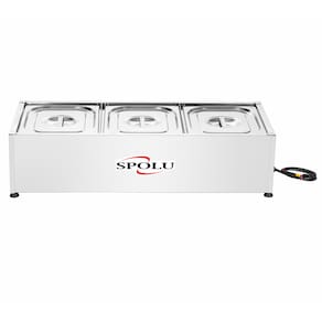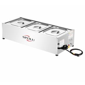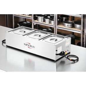A função do RECHAUD 3 CUBAS SPOLU é manter os alimentos servidos em suas cubas quentes enquanto em exposição. Possui cubas fabricadas em aço inox 201, tanque, tampas e moldura externa em aço inox 430. Sua resistência blindada é confeccionada em aço inox e controlada por um termostato com escala de 30ºC a 120ºC. Possui uma lâmpada piloto em seu painel indicando a função liga/desliga do termostato. Produtos SPOLU - CONCEITO DE QUALIDADE.