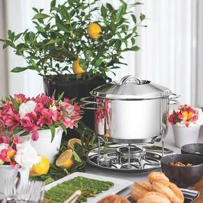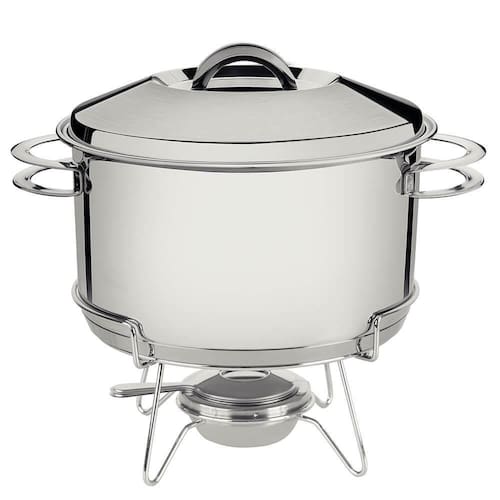 INFORMAÇÕES GERAIS - Totalmente feito de aço inox, não solta nenhum resíduo nos alimentos, mantendo-os saudáveis. Seu desenho limpo e sem cantos torna a limpeza muito mais fácil. - O fundo triplo (aço inox + alumínio + aço inox) distribui o calor uniformemente, proporcionando um cozimento mais rápido e uniforme, economizando energia e deixando os alimentos aquecidos por mais tempo. - As alças facilitam o transporte. - Conserva os alimentos na temperatura ideal. - Próprio para uso em bufês ou eventos. - Acompanha fogareiro de aço inox. - Além de funcionar como rechaud, pode-se utilizar como panela, bastando apenas retirá-la do suporte.