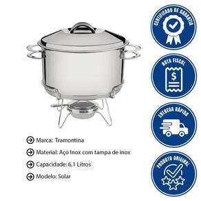 RECHAUD TRAMONTINA SOLAR EM AÇO INOX FUNDO TRIPLO COM FOGAREIRO E TAMPA DE INOX 6,1 L CÓD. 65500670 Marca: Tramontina Modelo: Aço Inox Fundo Triplo com Fogareiro e Alças 6,1 L 65500/670