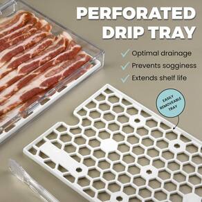 O recipiente de armazenamento de bacon GlossyEnd é o seu favorito para carnes frescas e organizadas. Feito de plástico durável e transparente, mantém sua geladeira limpa e seu bacon visível. Use as pinças práticas para pegar comida sem bagunçar suas mãos. A bandeja perfurada mantém a umidade afastada para que seu bacon permaneça fresco e saboroso. Com um tamanho de 28 x 16,5 x 5 cm, comporta muitas das suas carnes favoritas. Além disso, é adequado para lava-louças e freezer, tornando a limpeza super simples. - Durável e duradouro: nosso recipiente de armazenamento de bacon é feito de plástico resistente para resistir ao teste do tempo. Com um tamanho de 28 x 16,5 x 5 cm, uma fivela de fechamento forte e dobradiças suaves, este recipiente para bacon é perfeito para manter sua carne fresca e sua geladeira organizada. - Transparente e elegante: este recipiente de geladeira de bacon tem um design claro e elegante para que você possa ver o que está dentro. Chega de jogos de adivinhação, você sempre saberá quando é hora de reabastecer seu recipiente de bacon. - Pinças convenientes incluídas: cada guardião de bacon vem com pinças transparentes para lidar com todos os seus alimentos sem bagunça. Estas pinças práticas são perfeitas para alimentos quentes e frios, para que você nunca precise tocá-las com as mãos. - Mantém os alimentos frescos: a bandeja perfurada em nosso protetor de bacon significa uma drenagem ideal e mantém sua comida fresca por mais tempo. Chega de carne encharcada com este recipiente de comida de bacon que prolongará a vida útil da sua comida. - Fácil de limpar: projetado para sua conveniência, este recipiente de bacon é adequado para lava-louças. Aproveite a simplicidade de um recipiente sem esforço para manter e manter seu armazenamento de carne com aparência de novo.