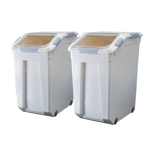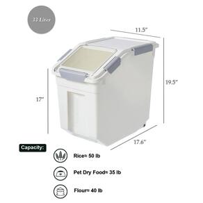 Este recipiente de armazenamento de alimentos é feito de material PP de grau alimentício, livre de BPA. É ideal para armazenar arroz, farinha, milho, feijão, alimentos secos para animais de estimação, etc. A capa hermética de silicone selada com uma tampa flip e 6 travas mantém os alimentos frescos e seguros e evita umidade e poeira. Ele é projetado em cinco tamanhos disponíveis para você escolher a melhor opção conforme necessário. O recipiente de armazenamento pode ser utilizado como um armazenador de arroz/grãos, armazenamento de despensa, recipiente de ração para animais de estimação para ração de cachorro, comida de gato ou semente de pássaros, bem como uma caixa de armazenamento para brinquedos, coleira, areia de gato, etc. - Este recipiente de armazenamento de alimentos é feito de material PP livre de BPA, vem com um copo de servir. - Capa hermética de silicone selada com uma tampa dobrável e 6 fechaduras: mantenha arroz, farinha, milho, feijão ou alimentos secos para animais de estimação frescos e saudáveis. É à prova de umidade, poeira e não vazamento. - 33 litros - 29 cm L x 44 cm x 40 cm A, comporta aproximadamente 22,7 kg de arroz ou 16 kg de ração seca para animais de estimação. - O design com pequeno sulco sob a tampa para uma pequena cesta, que é para colocar o "anis estrelado seco" ou "absorvente de umidade" (vendido separadamente) para proteger os alimentos de pragas e manter frescos. - Uma alça e quatro rodas: um design para facilitar o movimento e armazenamento.