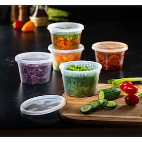 Perfeito para sopas, molhos, saladas de delicatessen e muito mais, este conjunto de recipiente e tampa de plástico translúcido de 473 ml é ótimo como recipientes de delicatessen, recipientes de preparação de refeições, recipientes de freezer, recipientes de armazenamento de alimentos e recipientes de alimentos em geral. Use-o para compras de clientes ou para armazenar alimentos. Feito de polipropileno pesado, este recipiente é resistente, ótimo para alimentos quentes e também pode ser utilizado no micro-ondas, permitindo aos seus clientes a conveniência de aquecer alimentos sem o incômodo de trocar os recipientes. A tampa que acompanha garante um ajuste confortável e seguro para eliminar sujeira e derramamentos.