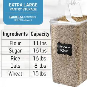 - ? Grande capacidade (8,5 L / 8,136 g cada) ? Inclui 2 recipientes grandes de armazenamento de açúcar de farinha de 8,5 L com tampas herméticas. Cada recipiente (30 cm A x 20 cm C x 17 cm) pode armazenar aproximadamente 5 kg de farinha, 7,3 kg de açúcar, 7,3 kg de arroz, 3,6 kg de aveia e 6,8 kg de trigo. Este conjunto vem com 2 copos medidores para facilitar o uso.