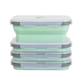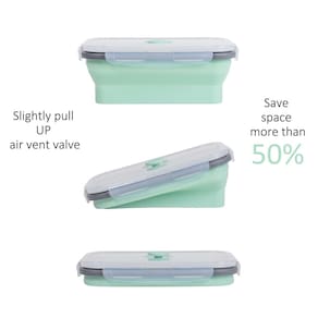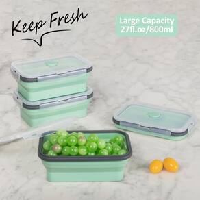 Recipientes dobráveis de armazenamento de alimentos com tampas e ventilação, 765 g, conjunto de recipientes dobráveis de silicone para preparo de refeições para sobras de cozinha, freezer de micro-ondas, lava-louças, verde menta, pacote com 4 - ?Tamanho grande?Grande capacidade: 800 ml. Estes recipientes dobráveis de armazenamento de alimentos com tampas são ótimos para adultos ou familiares. Conjunto de 4 unidades. Eles vêm em corpo de silicone verde menta e válvula de ventilação de ar. Você pode ver o que está dentro através da tampa transparente. Material de silicone de grau alimentício e livre de BPA. - ?Economia de espaço?Conjunto de recipientes para alimentos Annaklin dobrável feito de material de silicone de grau alimentício, macio e inquebrável. Não se preocupe com fragilidade. O design dobrável ajuda a economizar espaço em quase 50%. Cabe em quase todos os compartimentos de cozinha e despensa ou qualquer armário ou gaveta. - ?Seguro para micro-ondas, congelador e lava-louças?A tolerância à temperatura dos recipientes de armazenamento dobráveis de cozinha para alimentos é de -15,5 °C ~ 220 °C. Seguro para micro-ondas e congelador. Lembrete: a válvula de ventilação deve ser puxada para cima ou remover a tampa antes de aquecer. Pode ser lavado na lava-louças. Basta colocá-los na camada superior da máquina de lavar louça quando terminar de limpar sem complicações. - ?Fácil de usar?4 fivelas de pressão e anel de vedação de silicone de alta qualidade na tampa ajudam a manter seus alimentos frescos por um longo tempo e protegê-los da poluição do clima quente ou insetos. Experiência do cliente: ao fixar a tampa, certifique-se de pressionar apenas as abas laterais. Não pressione a tampa, ou o recipiente pode desmoronar e o conteúdo derramar. - Multifuncional: estes recipientes dobráveis para alimentos podem ser utilizados na geladeira para armazenar convenientemente sobras, frutas, legumes. utilizado em uma despensa para armazenar cereais, aveia, açúcar, pó. Estes recipientes dobráveis também podem ser utilizados como lancheira para crianças ou trabalhadores ao ar livre. Quando você planeja um acampamento, caminhada, viagem ou um piquenique, é ótimo levar este tupperware dobrável para levar comida. As opções são infinitas.