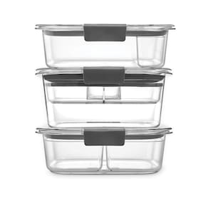 Rubbermaid Conjunto de 3 recipientes de armazenamento de alimentos Brilliance sem BPA com tampas, bandejas removíveis, herméticas, à prova de vazamento, ideais para preparação de refeições, almoço e - 100% hermético e à prova de vazamento: os recipientes Rubbermaid Brilliance fornecem armazenamento e transporte seguros criando uma vedação hermética - Bandejas personalizáveis: vem com bandejas removíveis para armazenamento organizado e separado de vários alimentos - Leve e durável: feito de plástico Tritan livre de BPA para clareza semelhante ao vidro sem o peso ou risco de estilhaços - Resistente a manchas: construído com material resistente a manchas e odores para manter uma aparência fresca e clara mesmo após uso repetido - Seguro para micro-ondas resistente a respingos: projetado com aberturas embutidas nas tampas para micro-ondas sem respingos - Armazenamento eficiente: economia de espaço, design modular para otimizar o espaço de armazenamento em geladeiras e despensas - Segurança em primeiro lugar: os recipientes sem BPA são seguros para uso em freezer, micro-ondas e lava-louças