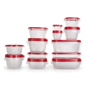 Rubbermaid Recipientes de armazenamento de alimentos TakeAlongs, conjunto de 26, transparentes - Embalagem múltipla de recipientes retangulares de armazenamento de alimentos Rubbermaid TakeAlongs; recipientes de plástico são ótimos para preparar refeições, almoço, lanches, sobras e muito mais - Recipientes de armazenamento de alimentos em uma variedade de tamanhos têm tampas atualizadas e mais duráveis em um vermelho rubi brilhante - As tampas de vedação Quik Clik fazem um clique audível para que você saiba que estão fechadas com segurança; as tampas têm sulcos para facilitar o empilhamento, ocupando menos espaço em seus armários e geladeira - Livre de BPA, prateleira superior, lavável na lava-louças e no freezer; a base é segura para reaquecimento de micro-ondas - O conjunto contém quatro 0. 5 xícaras, quatro 3. 2 xícaras, quatro 2. 1 xícara, quatro 2. 9 xícaras, quatro 5. 2 xícaras, quatro recipientes de 4 xícaras e dois recipientes de 8 xícaras, além de tampas, para um total de 52 peças