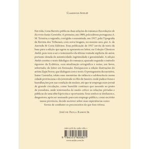 Em vida, Lima Barreto publicou duas edições do romance Recordações do Escrivão Isaías Caminha. A primeira, em 1909, pela editora portuguesa A. M. Teixeira; a segunda, corrigida e aumentada, em 1917, pela Tipografia da Revista dos Tribunais, com nova tiragem, no mesmo ano, por A. de Azevedo & Costa Editores. Essa publicação de 1917 serviu de texto de base para a edição que agora se apresenta ao leitor, na Coleção Clássicos Ateliê, pois vem a ser o testemunho da última vontade explícita do autor, portanto dotada de autenticidade, legitimidade e genuinidade. A edição Ateliê contém o texto fidedigno do romance, apurado segundo o método rigoroso da Ecdótica, com atualização ortográfica e notas, em favor, sobretudo, do leitor em formação. Enriquecem a edição ilustrações do artista Zepa Ferrer, que dialogam com o texto. O protagonista da narrativa, Isaías Caminha, relata suas memórias da infância e adolescência numa cidade provinciana e da juventude no Rio de Janeiro, onde padece fome e humilhações por sua condição de mestiço, até que se emprega num jornal de grande circulação, como humilde contínuo que ascende ao posto de jornalista, onde testemunha de modo crítico as relações privadas e públicas de uma elite hipócrita e oportunista. Seus sonhos se desfazem e, desgostoso, após ser nomeado para um emprego público, como escrivão numa província, decide escrever sobre suas experiências como forma de combater os preconceitos de que fora vítima. [José de Paula Ramos Jr.]  Apresentação, Estabelecimento de Texto e Notas: José de Paula Ramos Jr.  Ilustrações: Zepa Ferrer