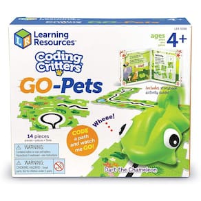 Pronto, defina o código! Prepare-se para distorcer, girando aventuras de codificação de livros de histórias com Dart, o Camaleão, um dos Criadores de Codificação Go-Pets da Learning Resources. Este animal de estimação interativo motorizado inteligente sabe como seguir caminhos de linha preta para todos os tipos de aventuras na selva! Acompanhe a história de Dart no livro de atividades de codificação de cores completas de 12 páginas do conjunto e, em seguida, organize as 16 telhas incluídas do conjunto para codificar sua criatura e alcançar um objetivo! Toda aventura com dardo ajuda as crianças a dominar os blocos de construção de codificação e STEM, desde a contagem e números ordinais até o pensamento sequencial e o pensamento computacional! Dardo, o Camaleão, está pronto para uma jogada imaginativa de ponta aberta; desenhar seus próprios caminhos de linha preta para ele seguir, ou virar as telhas para segmentos extras de linha preta que ajudam a estender a diversão de aprendizagem pré-escolar! Dart também trabalha com todos os Patrões de Codificação — que tipo de aventuras de codificação você pode sonhar?