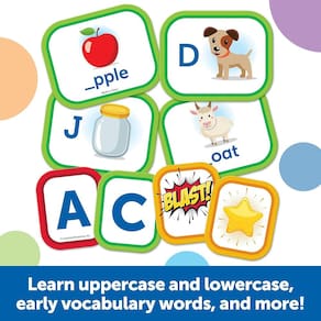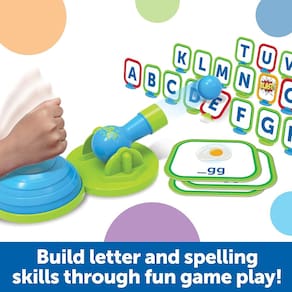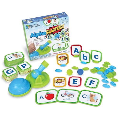 Recursos de aprendizagem Alphablasters! Jogo de letras e ortografia - 85 peças, crianças de 4 anos ou mais, ensino pré-escolar, jogos educativos de salão, alfabeto pré-escolar, jogos cerebrais para crianças pequenas - mire nas habilidades do alfabeto pré-escolar: crianças tiram uma carta, apontam o canhão de ar e disparam enquanto derrubam as letras necessárias para soletrar suas palavras! - Aprenda o básico do idioma: à medida que se divertem, as crianças também aprenderão letras maiúsculas e minúsculas, palavras de vocabulário e mais itens essenciais do alfabeto pré-escolar! - Várias maneiras de jogar: projetado para 1 a 4 jogadores, este jogo de alfabeto para crianças oferece suporte a jogos individuais, desafios frente a frente e jogos em grupo! - Idades e estágios: especialmente projetados pensando nos pequenos, Alphablasters! O Letter & Spelling Game é um brinquedo educacional para crianças de 4 anos que desenvolve habilidades linguísticas prontas para a escola! - Dê o presente de aprender: se você está comprando para feriados, aniversários ou suprimentos para o jardim de infância em casa, os brinquedos da Learning Resources ajudam você a descobrir uma nova diversão de aprendizagem sempre que você dá um presente!