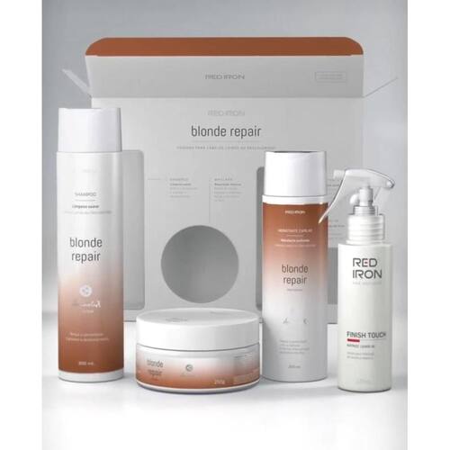 Red iron caixa kit blonde repair 3+1 A linha blonde repair foi desenvolvida para cabelos loiros, descoloridos ou com mechas. Com a tecnologia aminolux system, um sistema exclusivo da red iron, que combina proteínas, lipídios e vitaminas para restaurar e criar um escudo protetor, impedindo a ação dos radicais livres. A descoloração pode deixar os cabelos loiros ressecados, porosos, quebradiços e sem brilho. O aminolux system, com alta compatibilidade com a fibra capilar, penetra no córtex, promovendo reparação de dentro para fora e fechando as cutículas. Contém aminoácidos biofuncionais do trigo para repor moléculas de proteínas. O kit desta linha contém: 01 shampoo 300ml + 01 condicionador 250ml + 01 máscara 250g + 01 finalizador anti frizz 120ml
