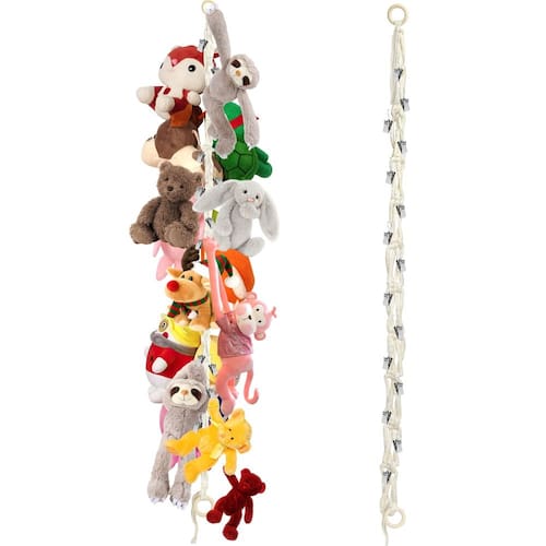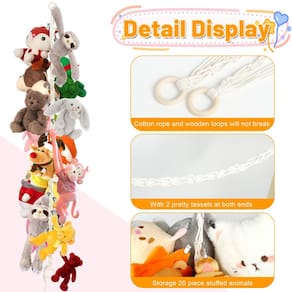 Características: Economia de espaço O porta-redes para bonecas de pelúcia de canto pode aproveitar ao máximo a posição do canto, manter a casa arrumada e liberar espaço valioso para seus filhos brincarem. É uma alternativa aos pufes, caixas de armazenamento, cestos e caixas sanitárias . Presente perfeito Ótima ideia de presente para chás de filha e bebê. Uma maneira divertida de exibir bichos de pelúcia, bichos de pelúcia para animais de estimação, bonecas, bolas, cobertores e travesseiros. Ótimo para armazenamento e organização de berçários e quartos infantis . Ferramenta de ensino O organizador de correntes de rede para bonecas pode ser aplicado como uma boa ferramenta de ensino, que fornece um local para limpar a boneca. Seus filhos começarão a colecionar a boneca sozinhos e desenvolverão o hábito de se organizarem. Crie uma atmosfera acolhedora A corrente de armazenamento pode ser pendurada horizontalmente, o que permite pendurar fotos de família e imagens de arte nela, criando uma atmosfera acolhedora em sua casa. -?Robusta e durável?Esta corrente para pendurar bichos de pelúcia é feita de corda grossa de algodão e argola de madeira, que é mais forte e durável. E os clipes são feitos de aço inoxidável, com forte capacidade de carga e durabilidade, podendo segurar sua boneca de pelúcia por muito tempo. -?Opção de suspensão dupla?O armazenamento de bichos de pelúcia suspenso nos cantos pode ser pendurado na horizontal ou na vertical, o que pode satisfazer suas diferentes necessidades de suspensão. O design da rede de pelúcia faz com que a boneca tenha boa visibilidade, adequada para exibir bichos de pelúcia. A rede boho para bichos de pelúcia também é uma boa decoração de quarto, adicione um pouco de diversão ao quarto, sala de jogos ou berçário do seu filho. -?Pacote incluído?Você receberá uma rede de algodão de pelúcia de 78 polegadas com 20 clipes de metal incluídos, quantidade suficiente para atender às suas demandas de suspensão. O clipe é removível, você pode ajustar a distância entre os clipes com base no tamanho da boneca para obter um melhor efeito de exibição. -?Amplamente utilizada?Nossa rede de armazenamento de algodão pode ser aplicada para pendurar bonecas de pelúcia, cachecóis, cobertores, gravatas, meias, chapéus, luvas, cartões de Natal, exposições de arte, etc. Aproveitando ao máximo todos os cantos, ajudando você a economizar espaço de armazenamento. -?Canto de rede para bichos de pelúcia?A rede suspensa para canto de bichos de pelúcia pode economizar muito espaço de armazenamento. Libere espaço no chão e na cama no quarto das crianças, mantenha seu quarto arrumado e espaçoso. E as crianças desenvolverão bons hábitos para arrumar a boneca.