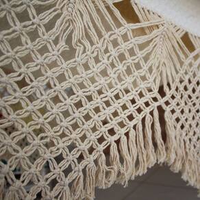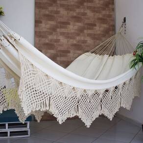 Lançamento especial de uma rede de descanso na Cor Bege Algodão Cru , seu tecido altamente resistente tem um auto relevo que lembra o bucho de um boi, no nordeste essa rede tem o apelido de BUCHO DE BOI seu babado varanda é feito pelo mesmo fio em que a rede foi produzida, com um acabamento artesanal valorizndo a cultura nordestina em produzir redes feita a mão.
