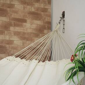 Dimensões: 2,80 m x 1,65 m só tecido Dimensões da Madeira : 1.20 m Comprimento Total: 4,20 m punho a punho Peso: +/ 5.000 kg Capacidade Máxima de Carga: 200 kg Composição: 100% Algodão Distância Ideal dos Ganchos: Aprox. 2,,90 a 3,30 m Altura Ideal dos Ganchos: Aprox. 1,90 m