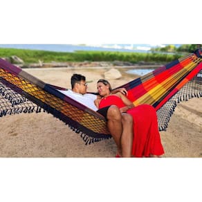 Rede de Dormir Descanso Casal Super King Colorida Gigante A rede super king toda feita em algodão, possui grandes dimensões para acomodar com conforto duas pessoas de grande estatura Confeccionada com algodão de alta qualidade que garante sua resistência e durabilidade.Especificações-comprimento total da rede 470 cm-comprimento total do tecido 300 cm-largura total do tecido 180 cm-capacidade máxima de peso 250 kg-peso total da rede 3,000 kg-composição 100% algodão Instalação recomendada-altura média do gancho em relação ao chão 160 cm-distância média entre os ganchos 330 cmAs informações acima podem variar de acordo com o ambiente que será feita a instalação da rede.