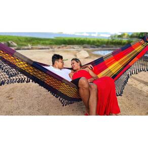 Rede de Dormir Descanso Casal Super King Colorida Gigante A rede super king toda feita em algodão, possui grandes dimensões para acomodar com conforto duas pessoas de grande estatura Confeccionada com algodão de alta qualidade que garante sua resistência e durabilidade.Especificações-comprimento total da rede 470 cm-comprimento total do tecido 300 cm-largura total do tecido 180 cm-capacidade máxima de peso 250 kg-peso total da rede 3,000 kg-composição 100% algodão Instalação recomendada-altura média do gancho em relação ao chão 160 cm-distância média entre os ganchos 330 cmAs informações acima podem variar de acordo com o ambiente que será feita a instalação da rede.