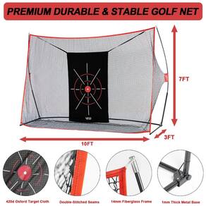 Componentes Inclusos: Rede de Golfe 10x7ft, 1 rede de chipagem com 3 zonas-alvo, Tapete de Golfe 2 em 1, 6 bolas de golfe PU, 7 tees de golfe, 1 tee de borracha, 4 estacas, 1 bolsa de transporte