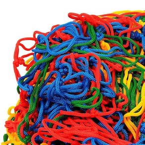 - Rede de malha multicolorida, confeccionada a mão, com fio de polipropileno.