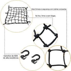 Ideal para capacetes, mochilas, bolsas, jaquetas e pequenas bagagens, a rede vem equipada com ganchos plásticos reforçados, que proporcionam fixação rápida e prática no bagageiro, baú ou suporte da moto.