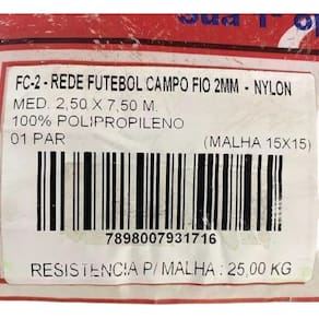 A rede de futebol de campo Master Rede fio 2mm é fabricada em 100% polipropileno virgem de alta qualidade, com tratamento ultravioleta que protege contra os efeitos do sol e da chuva, garantindo maior resistência e durabilidade. Com medidas oficiais de 2,50m de altura por 7,50m de largura, malha 15x15 e fio de 2mm, a rede suporta até 25kg por malha, oferecendo firmeza e segurança durante os jogos. O pacote acompanha um par de redes, ideal para montagem completa do campo. Sua estrutura proporciona visualização de qualidade e ótimo acabamento, além de contar com certificação de resistência em laboratório e garantia contra defeitos de fabricação. Uma escolha perfeita para quem busca confiança, durabilidade e padrão profissional em suas partidas de futebol.