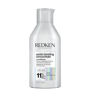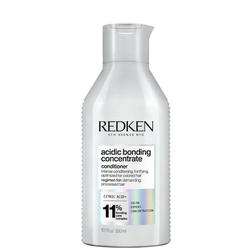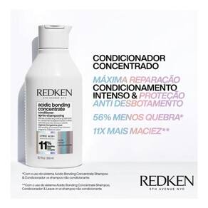 Redken Acidic Bonding ConcentrateCondicionador para cabelos secos e danificados. Redken Acidic Bonding Concentrate reforça as ligações enfraquecidas, protege e fortalece os fios.O Condicionador Redken Acidic Bonding Concentrate é enriquecido com um sistema de reparação concentrado, desenvolvido para cabelos secos e danificados. Sua ação oferece o máximo em reparação, força, condicionamento intenso e proteção contra o desbotamento da cor do cabelo, além de ajudar a equilibrar o pH para um cabelo mais saudável.Existem inúmeras maneiras de danificar os cabelos: processos químicos, exposição ao sol e por processos de aquecimento, como secadores de cabelos e pranchas. Este condicionador é o 2º passo de 3 etapas de um sistema de reparação de danos. Sua fórmula contém ácido cítrico e Redken Bonding Complex, ativos que promovem resultados instantaneamente visíveis. O uso do sistema completo Redken Acidic Bonding Concentrate resulta em 82% menos pontas duplas, 56% menos quebra e 11x mais maciez.