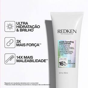 Redken acidic bonding concentrate 5-min é uma máscara ultra- condicionadora que proporciona hidratação e reparação profunda para todos os tipos de texturas e cabelos. Formulada com nosso mais intensivo conditioning care complex, uma alta concentração de agentes catiônicos e óleos condicionantes, esta máscara oferece desembaraço imediato e toque suave e hidratado. Deixa o cabelo com aparência e sensação mais saudável do que nunca. Resultado: hidratação Sugestões de uso: 1. Use como substituto do condicionador acidic bonding concentrate uma vez por semana ou sempre que necessário.2. Após a lavagem, aplique nos cabelos molhados, do meio às pontas.3. Deixe por 5 minutos.4. Enxágue bem. Itens inclusos: 1 redken acidic bonding concentrate máscara de hidratação 250ml Ean: 3474637152000