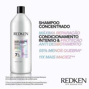 Shampoo para cabelos secos e danificados. Redken Acidic Bonding Concentrate oferece máxima reparação e proteção da fibra capilar. O Shampoo Redken Acidic Bonding Concentrate é enriquecido com um sistema de reparação concentrado, que reduz as chances dos fios se partirem. Sua ação confere força e condicionamento intenso, além de melhorar a resistência e equilibrar o pH para um cabelo mais saudável. Em cabelos descoloridos, age prevenindo o desbotamento da cor. Existem inúmeras maneiras de danificar os cabelos: processos químicos, exposição ao sol e por processos de aquecimento, como secadores de cabelos e pranchas. Este shampoo é o 1º passo de 3 etapas de um sistema de reparação de danos. Sua fórmula contém ácido cítrico e Redken Bonding Complex, que promovem resultados instantaneamente visíveis. O uso do sistema completo Redken Acidic Bonding Concentrate resulta em 82% menos pontas duplas, 56% menos quebra e 11x mais maciez.