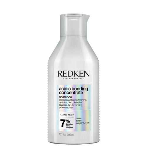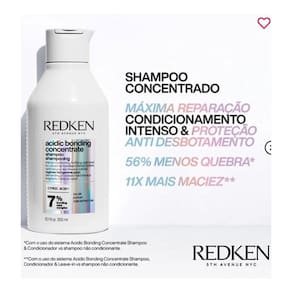 Redken Acidic Bonding ConcentrateShampoo para cabelos secos e danificados. Redken Acidic Bonding Concentrate oferece máxima reparação e proteção da fibra capilar.O Shampoo Redken Acidic Bonding Concentrate é enriquecido com um sistema de reparação concentrado, desenvolvido para cabelos secos e danificados. Sua ação confere força e condicionamento intenso, além de melhorar a resistência e equilibrar o pH para um cabelo mais saudável. Em fios descoloridos, age prevenindo o desbotamento da cor. Existem inúmeras maneiras de danificar os cabelos: processos químicos, exposição ao sol e por processos de aquecimento, como secadores de cabelos e pranchas. Este shampoo é o 1º passo de 3 etapas de um sistema de reparação de danos. Sua fórmula contém ácido cítrico e Redken Bonding Complex, que promovem resultados instantaneamente visíveis. O uso do sistema completo Redken Acidic Bonding Concentrate resulta em 82% menos pontas duplas, 56% menos quebra e 11x mais maciez.