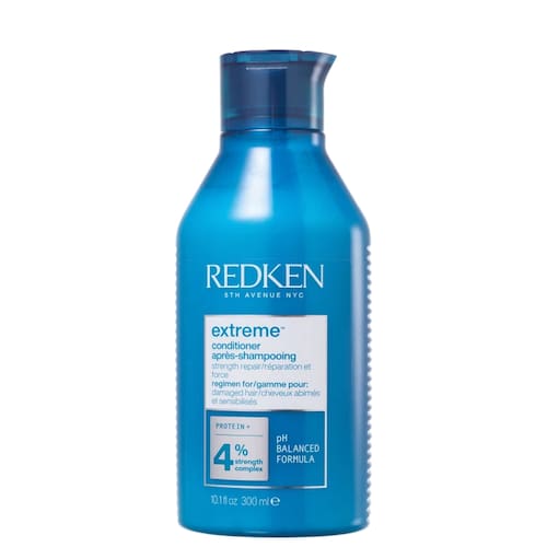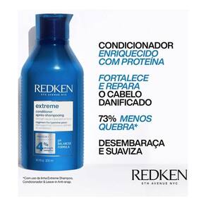 Redken ExtremeCondicionador fortalecedor para cabelos danificados e frágeis. Redken Extreme desembaraça e condiciona os fios enquanto recupera dos danos e aumenta a resistência. Ele age desde o interior da fibra capilar. Os ingredientes do Condicionador Redken Extreme fortalecem os fios, reforçando a cutícula e protegendo a superfície da fibra capilar para que se recuperem do danos sofridos. Seu cabelo fica desembaraçado e condicionado,além de saudável, forte e brilhante.